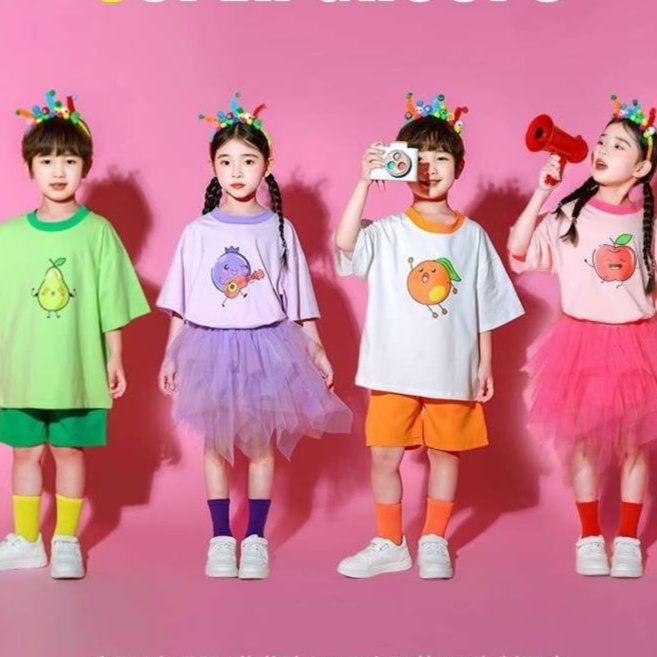可愛らしいフルーツイラストが特徴的なキッズ向けのダンスの洋服です。