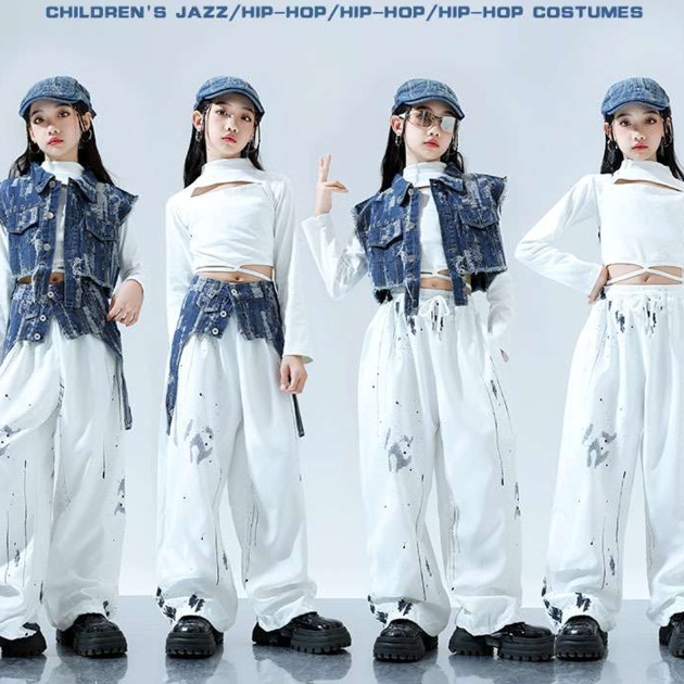 このガールズダンス衣装セットアップは、デニム風のベストとホワイトパンツを組み合わせたヒップホップスタイルです。