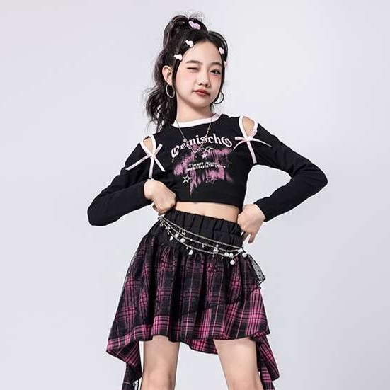 赤と黒のチェック柄スカートが個性的で、エッジの効いたダンスパフォーマンスにぴったりです。