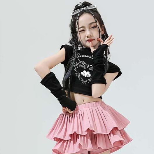 黒をベースにピンクのフリルスカートが特徴的な個性派kポップスタイルのダンス衣装です。