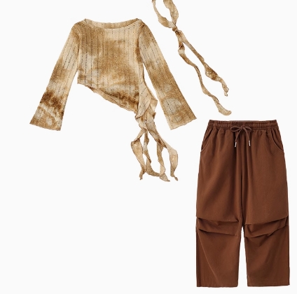 特徴的な帽子と装飾的なトップスに、ワイドパンツやスカートを組み合わせた個性豊かなデザイン。