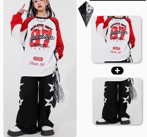 個性的なロゴプリントが特徴のキッズ用ダンス衣装。大きめのトップスと星柄パンツが絶妙に組み合わさり、動きやすさとスタイリッシュさを実現。ヒップホップやブレイクダンスに最適なクールなデザインで、子どもたちのパフォーマンスを一層引き立てます。目立つこと間違いなしのこの衣装で、ダンスの楽しさを思い切り表現しよう!