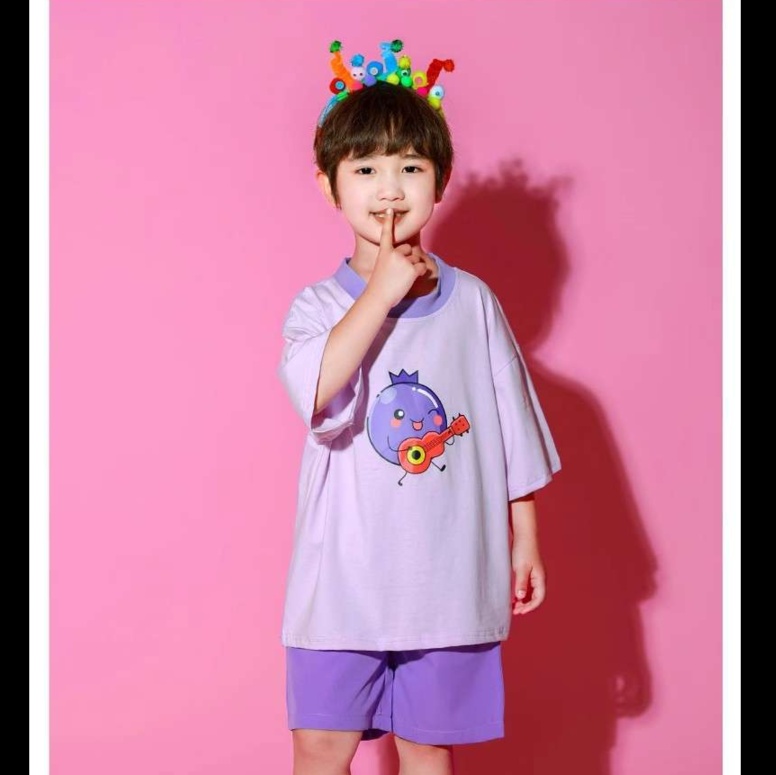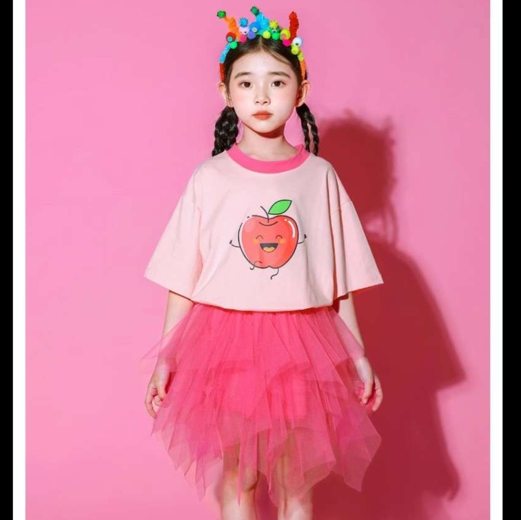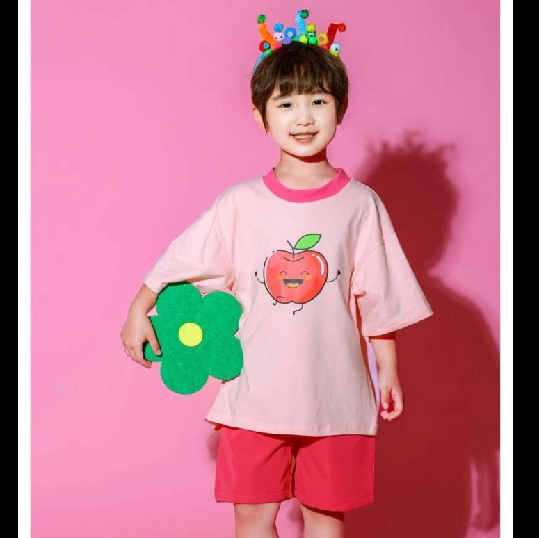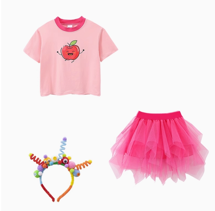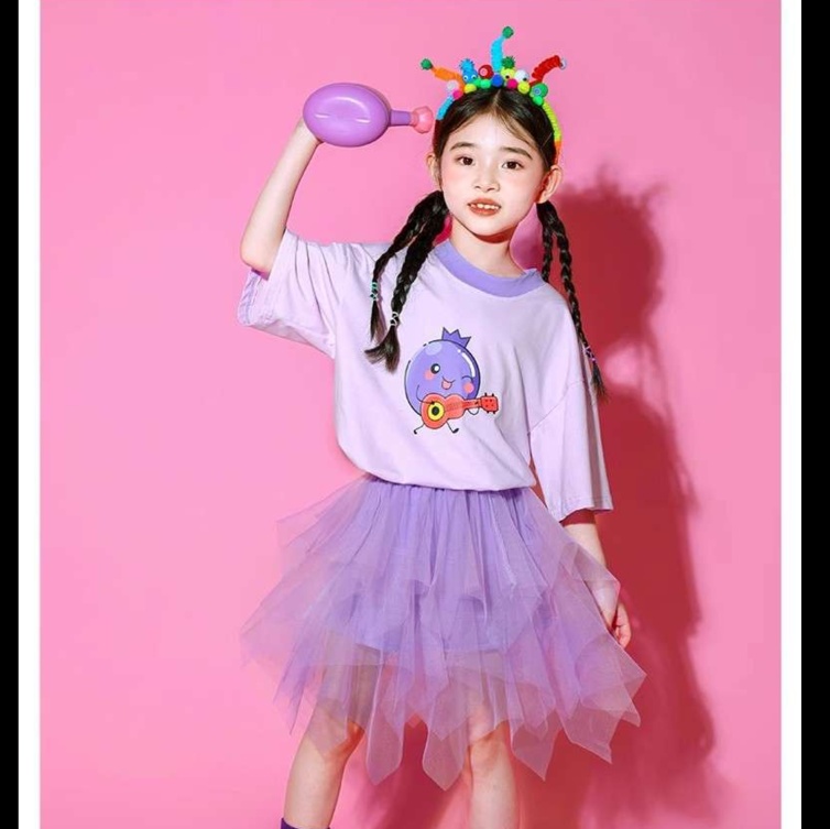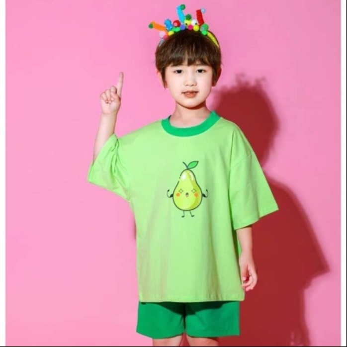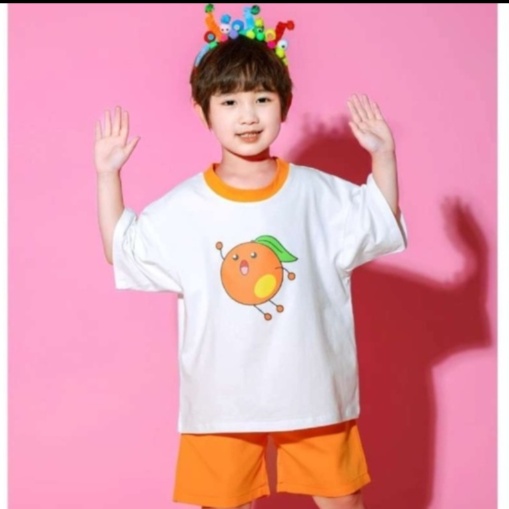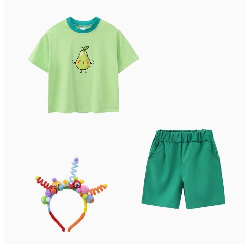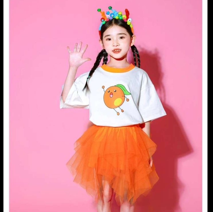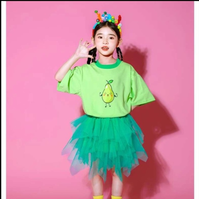 カラフルな果物のイラストが特徴的な、キッズ向けダンス衣装セットです。トップスとボトムスのセットで、チュチュスカートやショートパンツを含みます。頭にはポップな飾りつき。グループでの発表会や運動会に最適です。