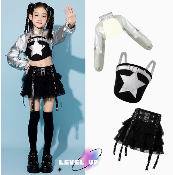 光沢のある長袖トップスと星柄ビスチェがスタイリッシュなキッズ向けダンス衣装です。
