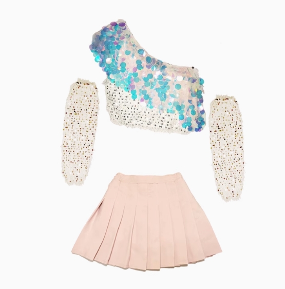 トップスの青いスパンコールが光を反射し、華やかで目を引くステージ映えするデザイン