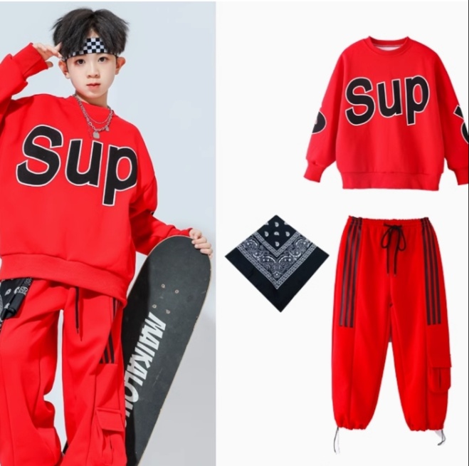 バンダナ柄のワンポイントが際立つキッズ用ダンス衣装。大きめロゴプリントのスウェットとゆったりシルエットのカーゴパンツが特徴で、動きやすさ抜群。ダンスのパフォーマンスを引き立てるスタイルで、スニーカーとも好相性。子どもたちが楽しく踊れる、オシャレで実用的な一着です。