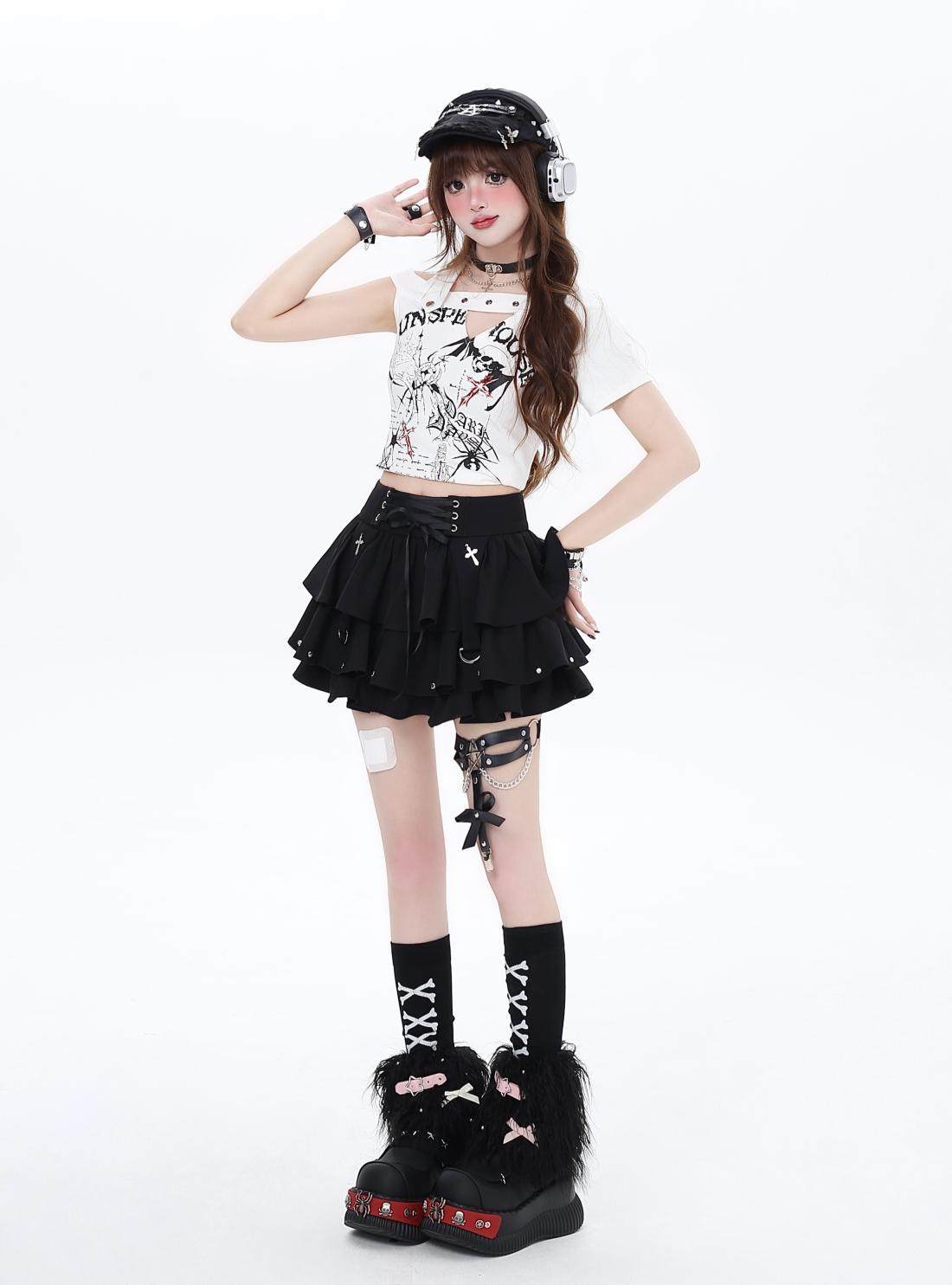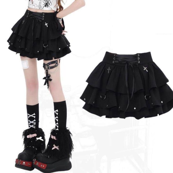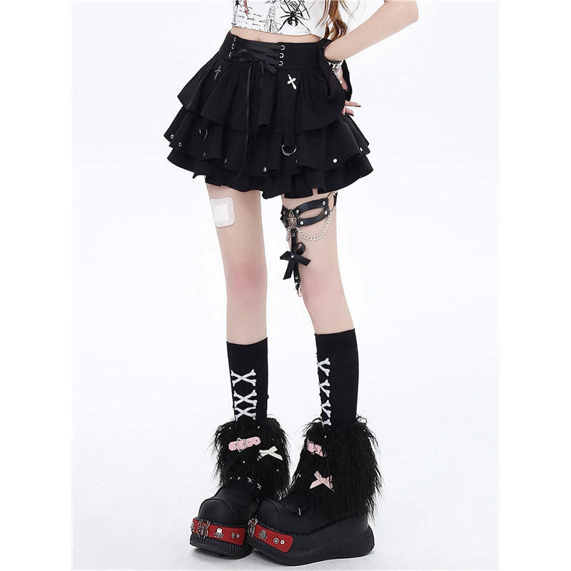 ウエスト部分には編み上げ風のデザインを施し、十字架や金属リングなどの装飾がゴシックな雰囲気を演出します。