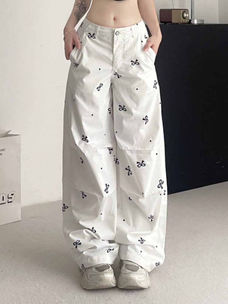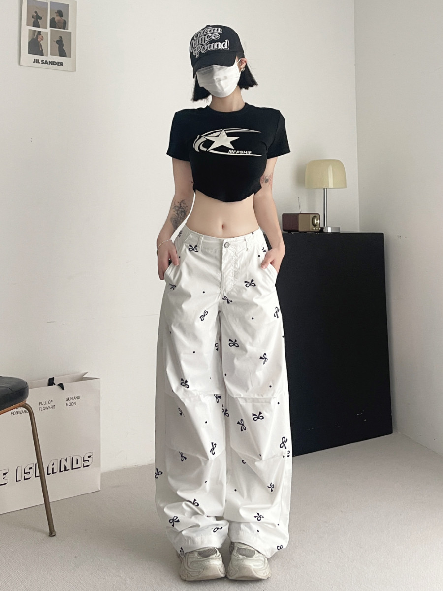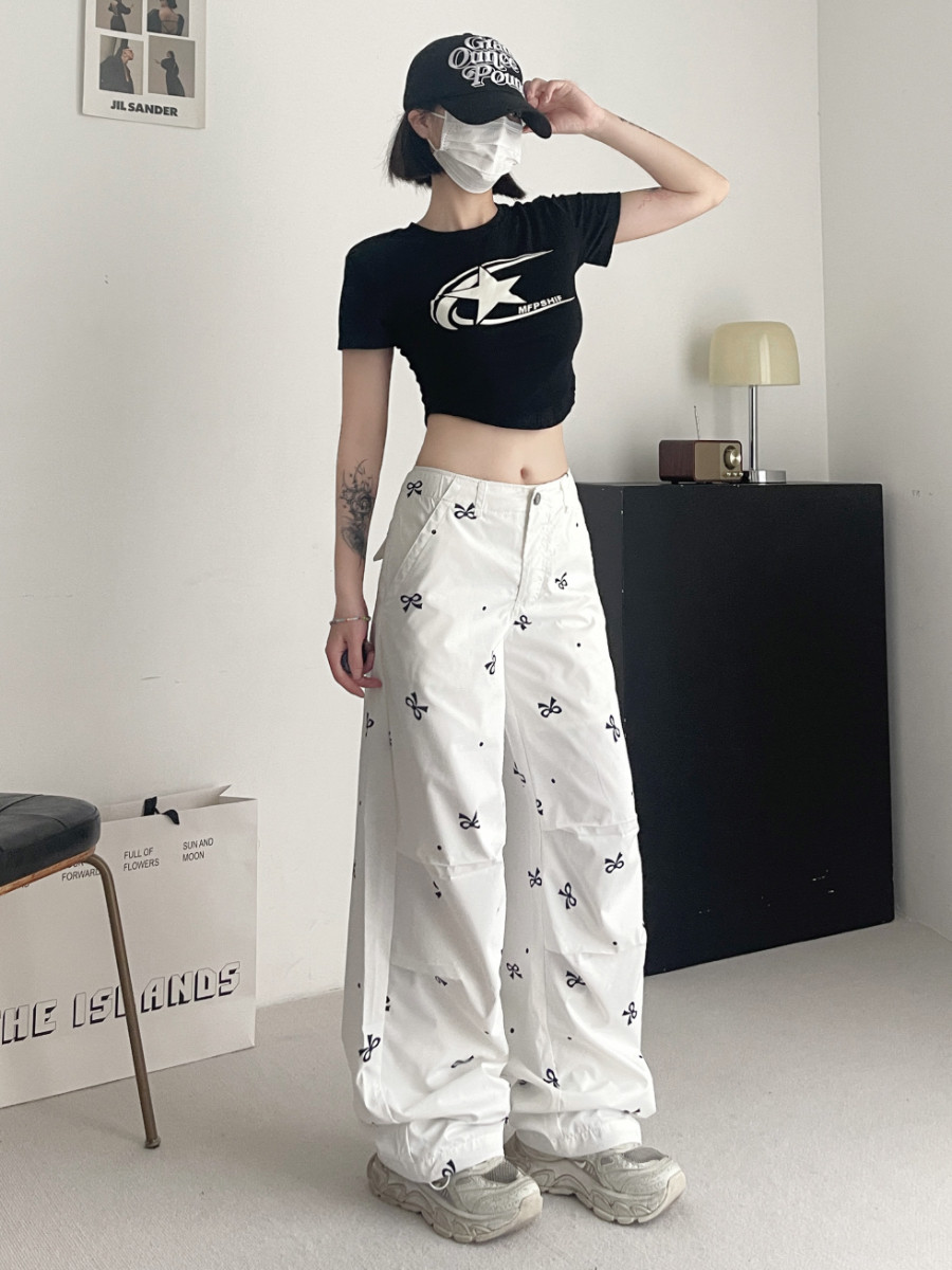 星のグラフィックが映えるショート丈トップスと、キュートなリボン模様が全面に散りばめられたゆったりシルエットのワイドパンツの組み合わせが魅力的です。