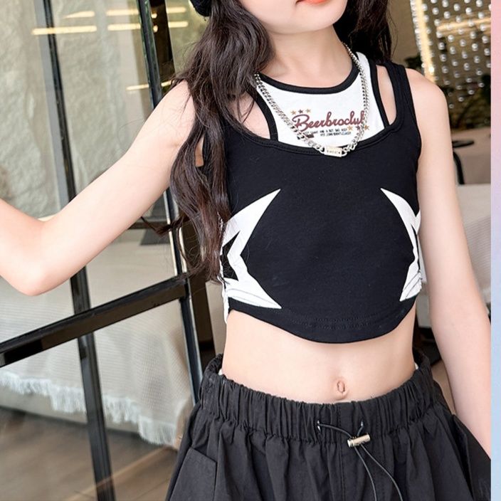 星の模様があしらわれたノースリーブクロップトップと、立体的なポケットデザインが特徴的なワイドカーゴパンツの組み合わせ。